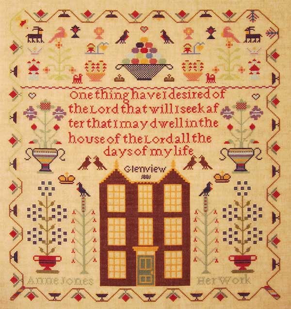 Anne Jones Circa 1891 ORDERING INFO Stitched on 32ct Lambswool linen in Au Ver A Soie stranded silk. Design size: 240W x 266H